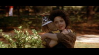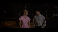 Immédiatement après, Jeffrey est filmé la nuit dans les rues de Lumberton et la caméra fixe les arbres en contre-plongée (à la façon de Hitchcock dans Vertigo [5]) avant qu’un nouveau fondu au noir ne fasse transition sur le plan de l’oreille en très gros plan, sur fond de musique inquiétante, et qu’un travelling avant ne s’enfonce dans le conduit auriculaire jusqu’à ce que l’écran redevienne noir. Lynch montre ensuite Jeffrey se rendant chez l’inspecteur et aussitôt la caméra fixe longuement le portrait de Sandy dans un cadre ovale. A l’issue de sa visite, et alors qu’il est dans le jardin de son hôte, une voix le fait se retourner. De nouveau, sur un fondu au noir accompagné d’une musique glissant de l’inquiétant des sons sourds au lyrisme épanoui des violons crescendo, surgit l’image, cette fois bien réelle, d’une Sandy tout de rose vêtue illuminant la nuit de sa radieuse présence, comme une protection contre le monde nocturne. (5)