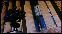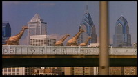 (3) Le virus se répand donc dans l’aéroport de Philadelphie et l’avion qui en décolle va le propager dans le monde entier. Il n’est sans doute pas fortuit que ce soit à Philadelphie, précisément, que fut signée en 1776 une Déclaration d’Indépendance des Etats-Unis dont la mission était de répandre la Liberté. Faut-il voir dans le choix de cette ville une allusion sarcastique de Gilliam ? D’autant plus que ses propos sur cette ville sont sans ambiguïté : « Tout dans Philadelphie - son architecture européenne désormais délabrée, sa pauvreté abjecte, ce design des lendemains de guerre - incarne la perte du rêve américain. La nostalgie, la pourriture, le déclin. » D’autres références sont à évoquer. De même que Robert Wise dans Le Jour où la terre s’arrêta (1951) faisait de son extra-terrestre, Klaatu, un Messie moderne, ne peut-on voir dans Cole une sorte de prophète contemporain que l’on ne met plus en croix, mais que l’on veut soigner par la psychiatrie comme on le fait pour un fou ? Dans le même ordre d’idée, on rappellera que Jeffrey – chef de l’« Armée des douze (comme les douze Apôtres) singes », parle de son père de façon explicite (« My father is God »/« Mon père est Dieu»).