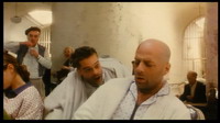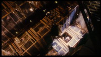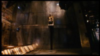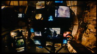 Une voix d’hôtesse d’aéroport assure la transition avec la séquence suivante : elle annonce, dans la même phrase, le départ du vol 807 à destination de Miami et les arrivées du détenu matricule 27631, Cole James, et du détenu 27631, Johnson Steve, cependant que l’image de l’enfant laisse place à celle d’un homme mûr et mal rasé, apparemment prisonnier, qui semble se réveiller d’un sommeil lourd et profond. Son voisin de cellule, un nommé José, lui signale qu’il vient d’être désigné comme volontaire. En fait de cellule, il s’agit d’un ensemble de conteneurs en forme de cages grillagées empilés les uns sur les autres et se jouxtant étroitement. Puis une grue extrait le prisonnier de sa cage, qui obéit à des instructions insistant sur l’étanchéité de l’équipement qu’il doit revêtir. Dûment enfermé dans sa combinaison et aspergé de produits désinfectants, James Cole se fraie un passage dans un univers glauque de tuyaux et de tunnels pour accéder à l’air libre en passant par une plaque d’égout soulevé. [5mn25]